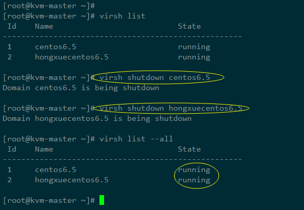 在下图中我分别对客户机 centos6.5 和 debian 试图执行 virsh shutdown 进行正常关闭,输出信息为: Domain “client” is being shutdown,但是通过 virsh list –all 进行查看